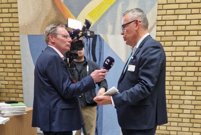 Forbundsleder Trond Ellefsen blir intervjuet av Stål Talsnes i TV 2. (Foto: Lise Boeck Jakobsen)