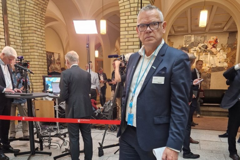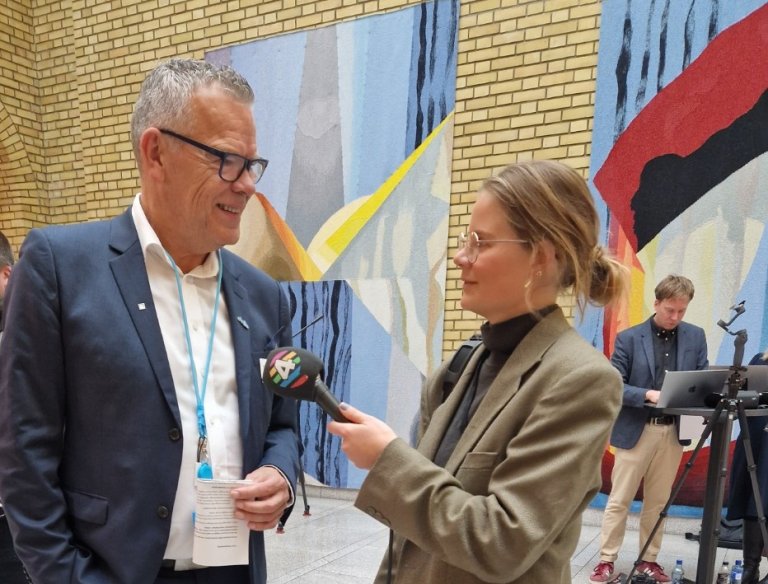 Deltas forbundsleder, Trond Ellefsen, blir intervjuet av P4 i Vandrehallen på Stortinget i forbindelse med statsbudsjettet for 2026. (Foto: Lise Boeck Jakobsen)