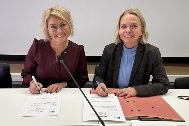 Deltas 1. nestleder Marit Solheim og Hege Mygland frå KS signerer hovudavtalen for 26-29.