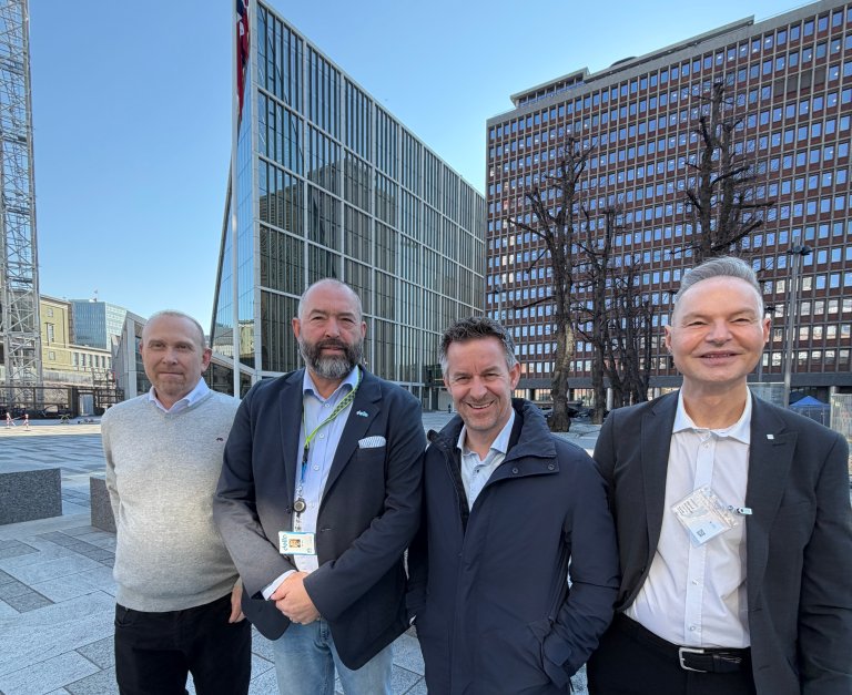 Klare til forhandlinger: Ivar Sømhovd, leder i SkL (t.v.), Ola Yttre, nestleder i Delta og leder av forhandlingsutvalget, Jens B. Jahren, leder i YS Stat og Øyvind Hov Randmæl, leder i AVYO utenfor de nye regjeringslokalene før forhandlingene startet. De gikk inn i departementet med klare krav. (Foto: Per Tandberg)